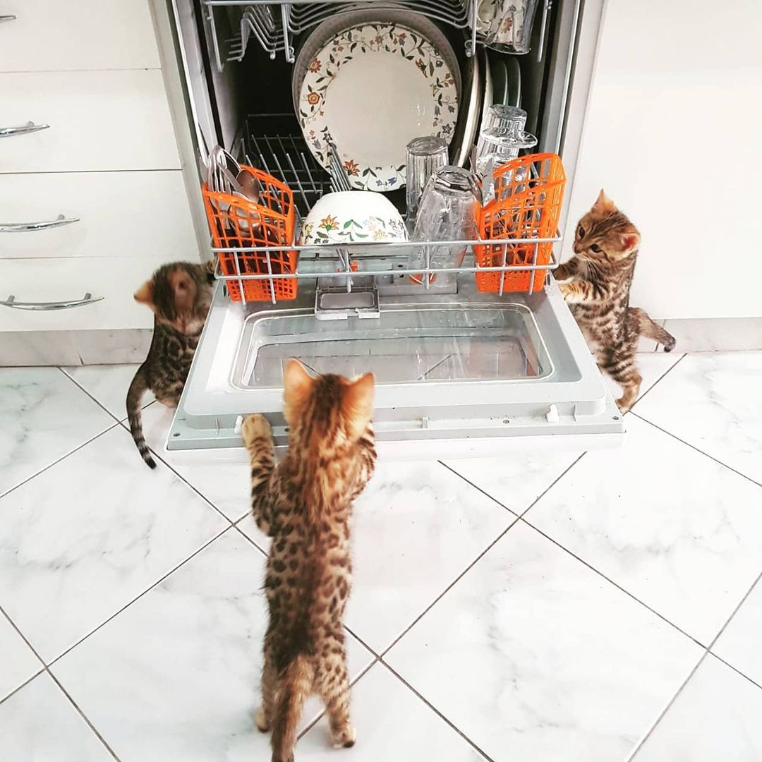 Os Bengal também são exímios escaladores, e não há prateleira que eles não possam escalar ou lugar inusitado onde eles não durmam. Só para deixar claro quem é que manda ali.